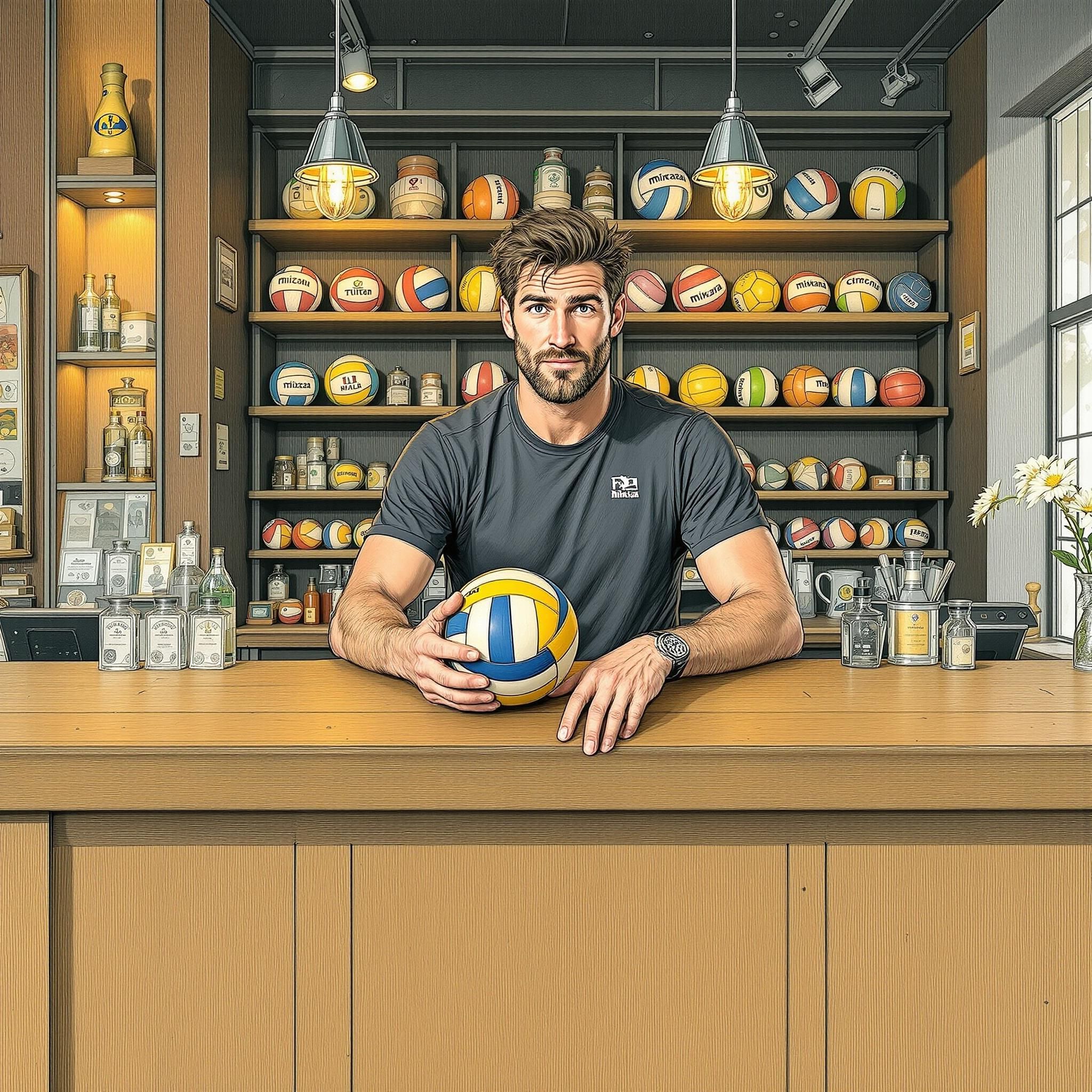 Ты направляешься к спортивному магазину “Волей&Тур” на углу площади. За прилавком стоит высокий блокирующий по имени Макс, крутящий в руках профессиональный мяч.