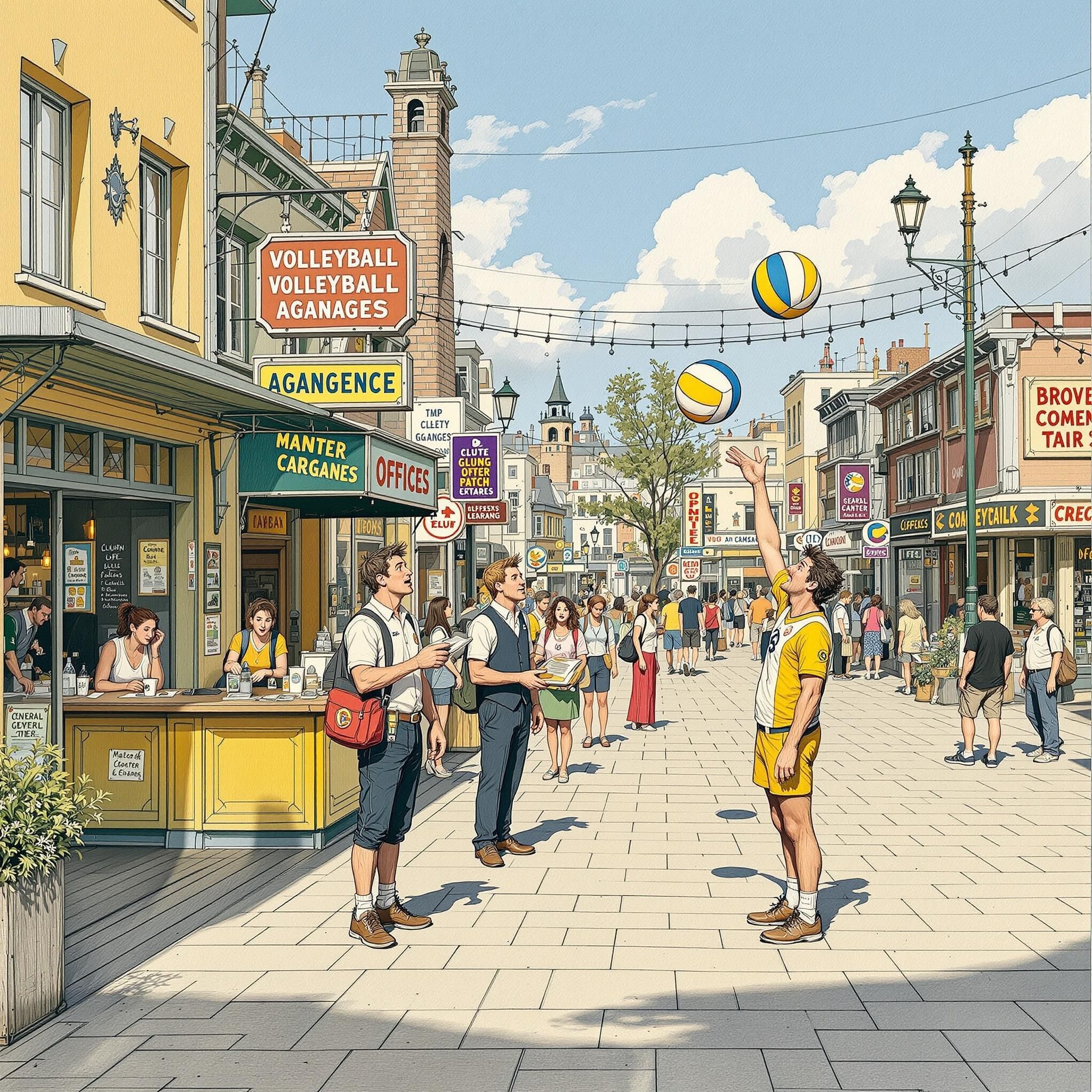 Ты стоишь на центральной площади города Спайк-Сити. Вокруг возвышаются офисы турфирм с волейбольными сетками вместо обычных витрин. Спортсмены в форме принимают клиентов, жонглируя мячами и предлагая экзотические туры.