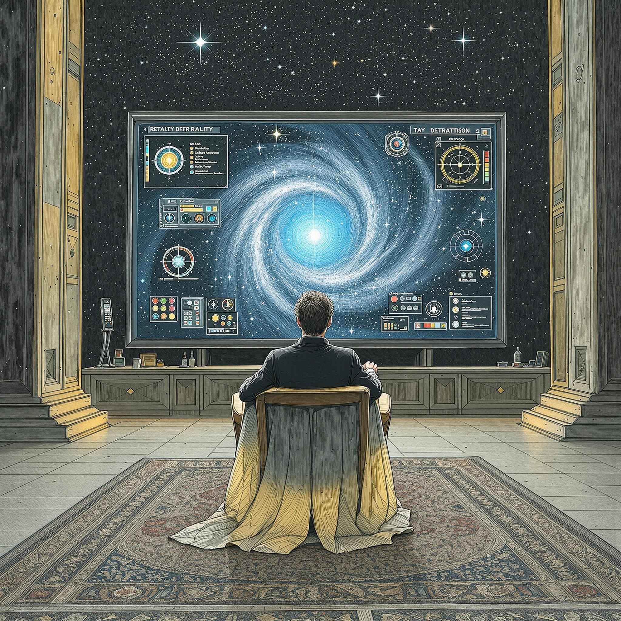 Отличная идея! Вы - могущественное космическое существо, сидящее в своем звёздном кресле перед гигантским межпространственным телевизором. В ваших руках пульт реальности с бесконечным количеством каналов.