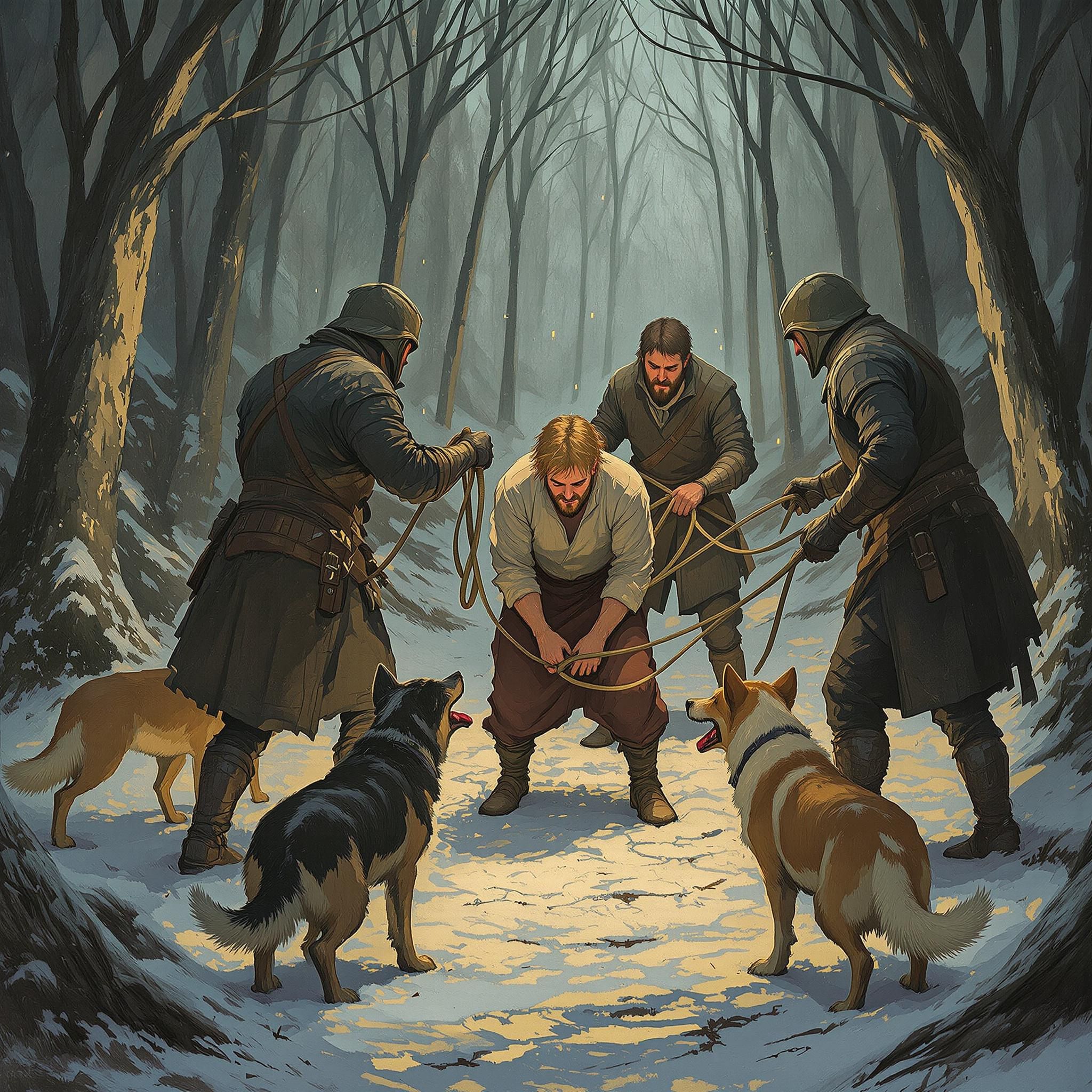Собаки рычат, окружив вас. Второй стражник накидывает на вас веревки. Холод пробирает до костей, пальцы уже не слушаются.