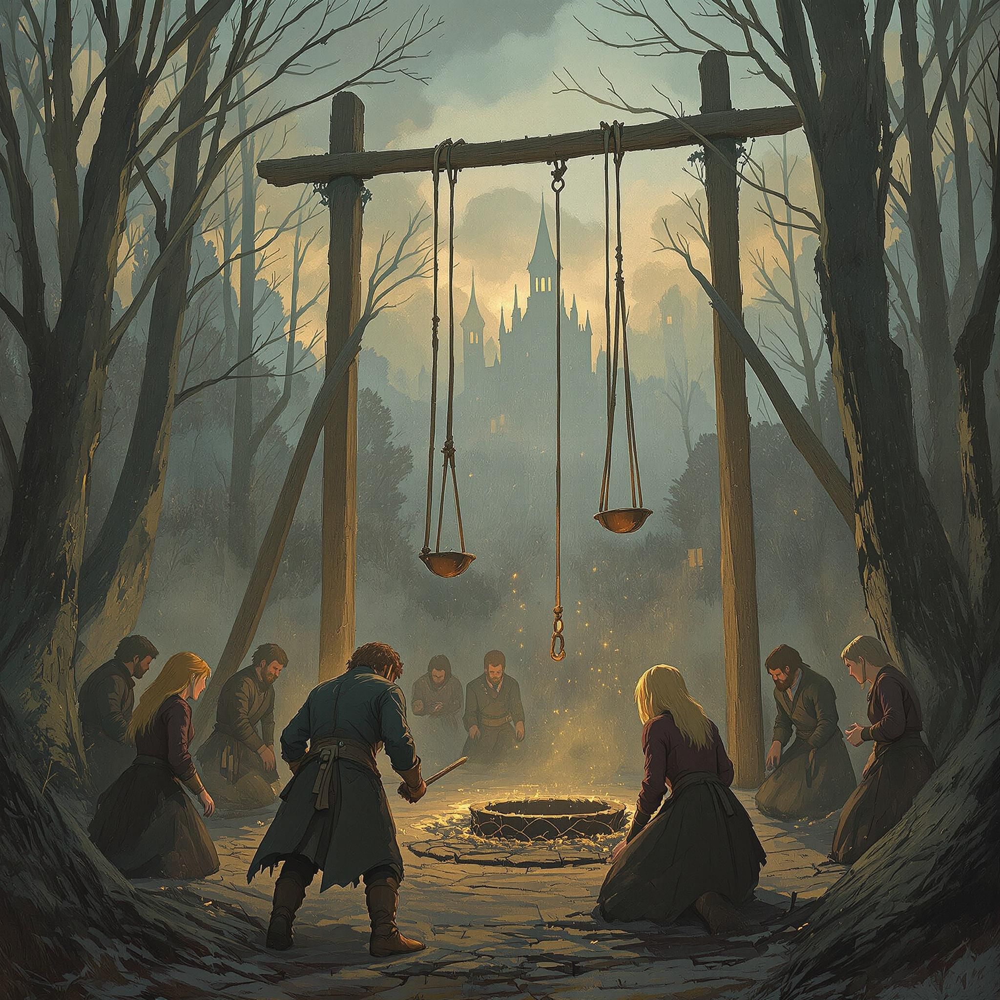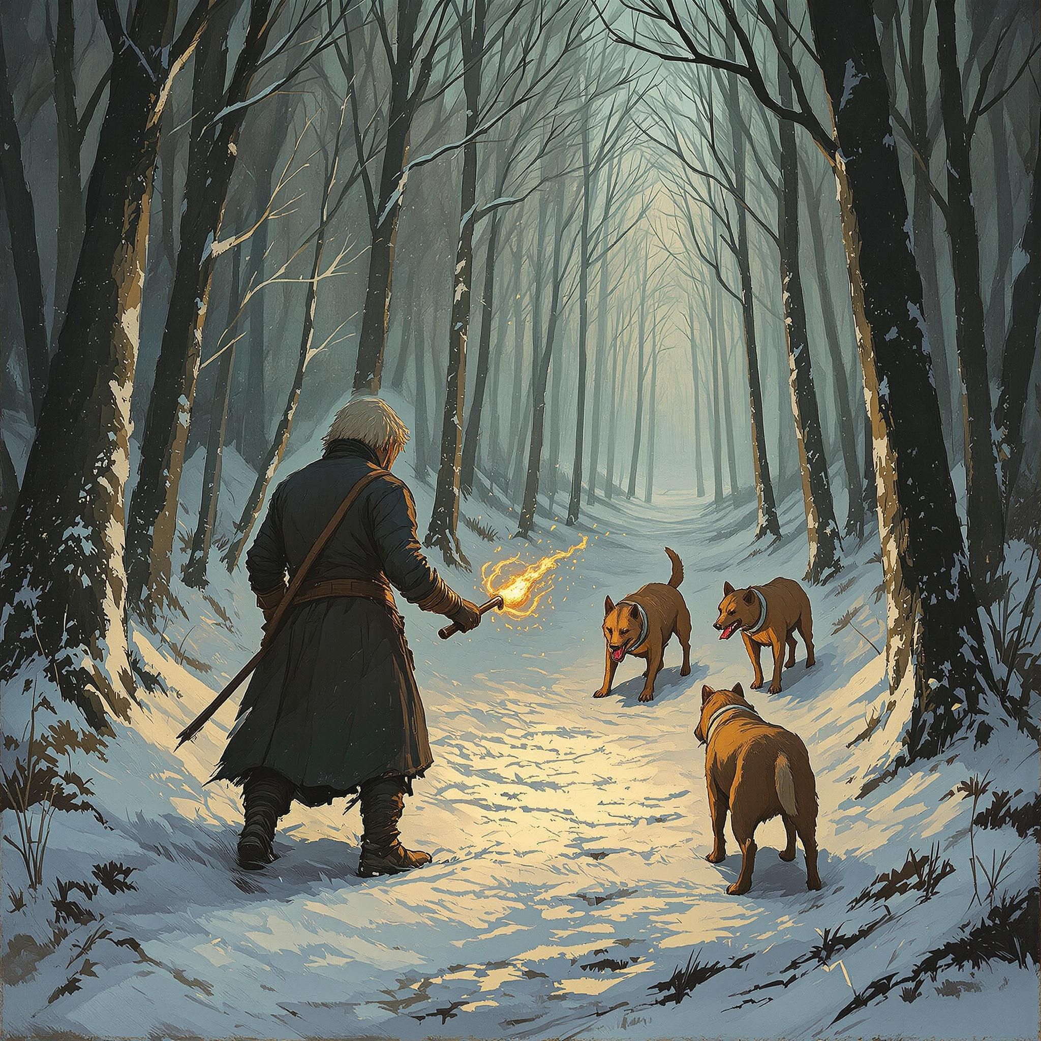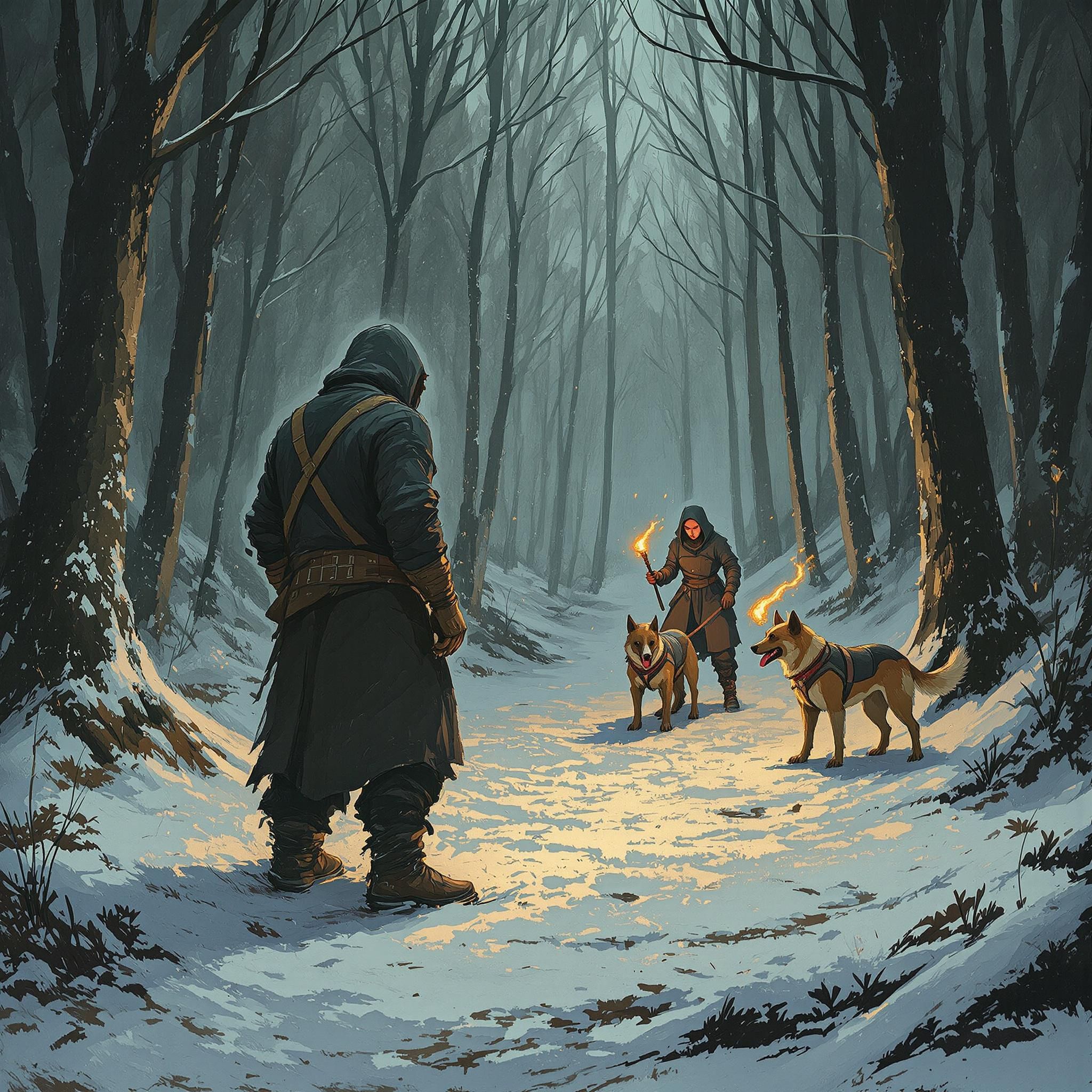 Голоса стражников всё ближе: “Сюда! Следы ведут к лесу!” Собачий лай - видимо, привели ищеек.