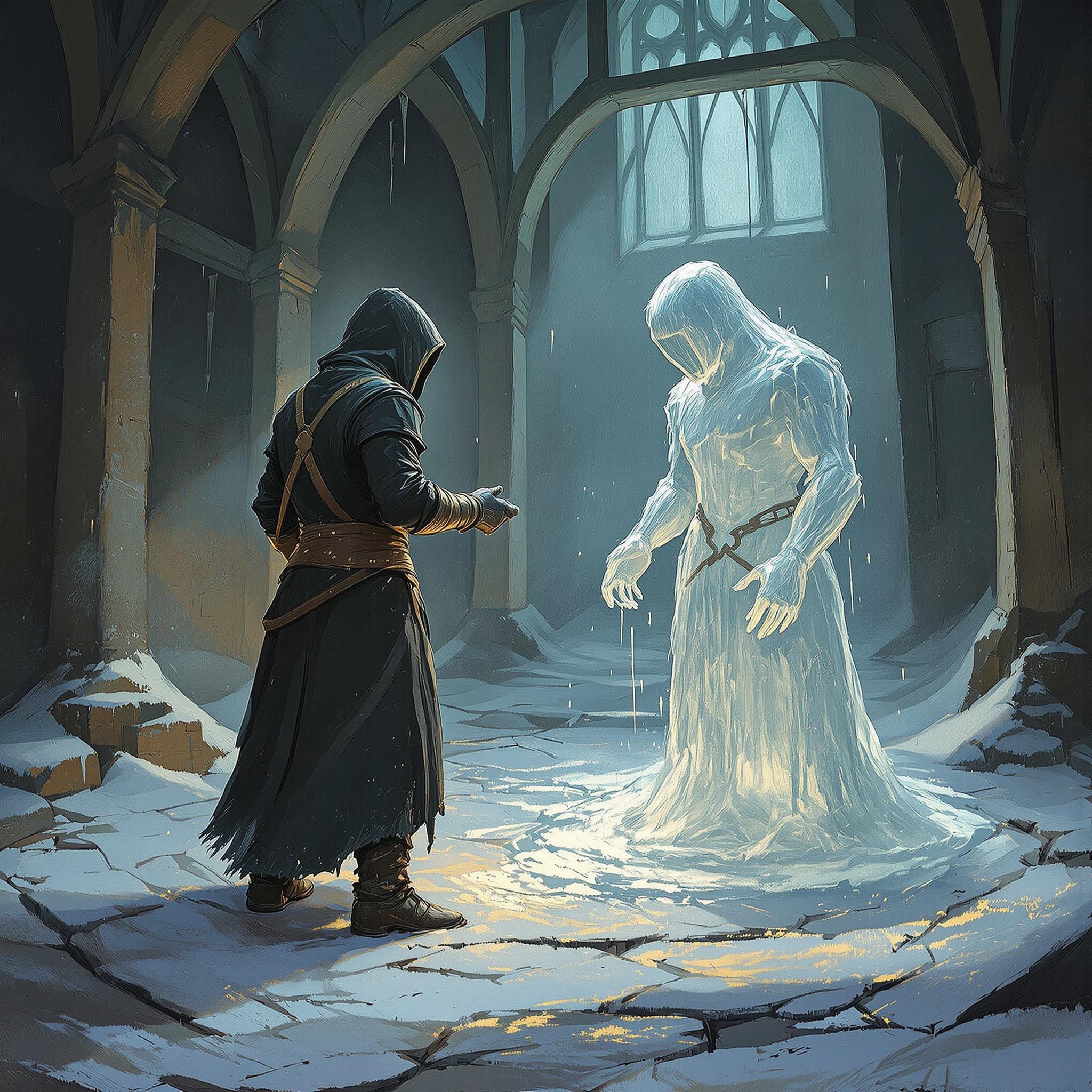 Ваши кандалы покрываются изморозью и лопаются. Замёрзший стрелец превратился в ледяную статую, но снаружи слышны шаги - прибегают люди с факелами.
