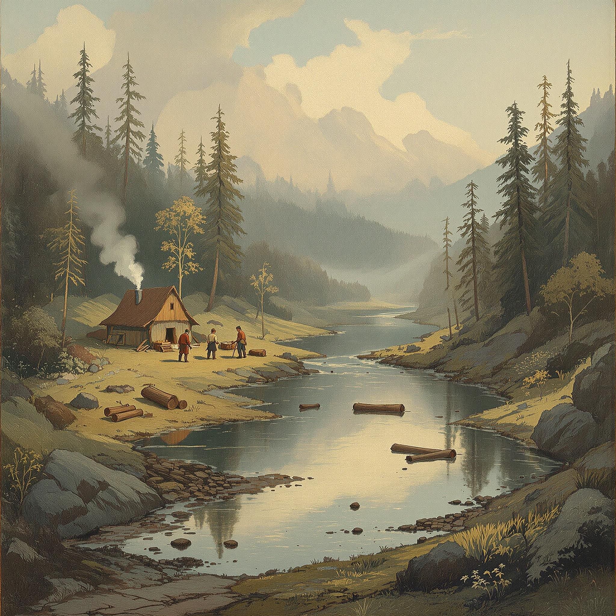 Неподалёку дымится временный лагерь строителей. На противоположном берегу видны следы геологических изысканий - ямы и отвалы породы. По реке сплавляют брёвна для будущего завода.