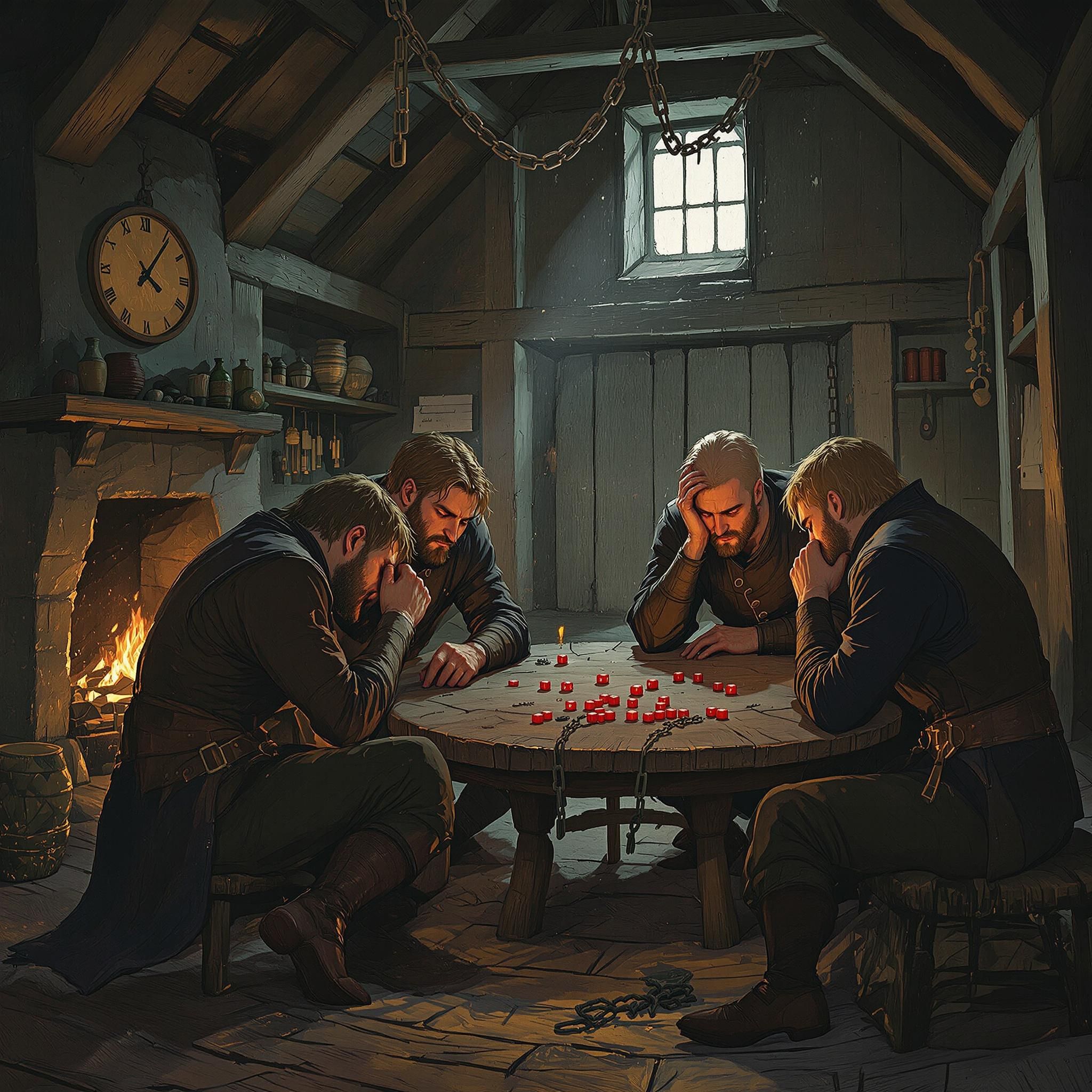 Один стрелец дремлет у печки, второй играет в кости с себе подобным у двери. На столе лежат ваши личные вещи и ключи от кандалов.